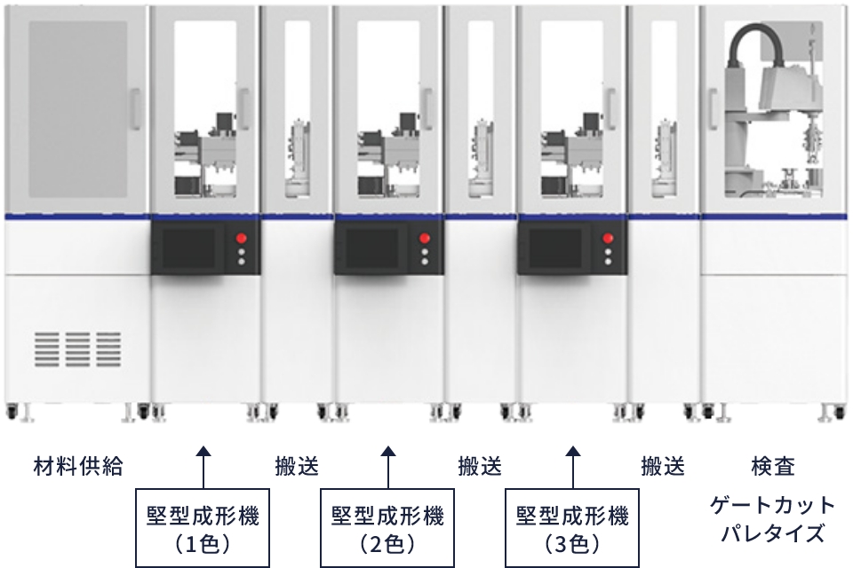 ホットランナーを成形機本体に搭載することにより、ランナーレス化で廃材レス、サイクルタイムの短縮を実現